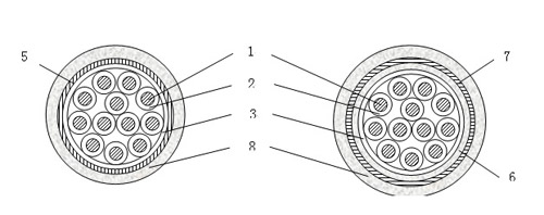 5--- 銅帶屏蔽; 6--- 內(nèi)護層; 7--- 鋼帶鎧裝; 8--- 聚烯烴護套。